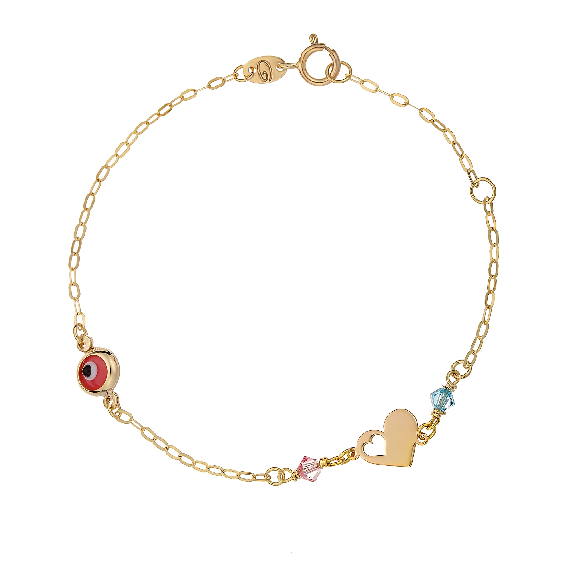 Βραχιόλι Ματάκι,Καρδιά, Χρυσό Για Γέννηση-Βάφτιση Με Ρόζ Σμάλτο 9Κ
