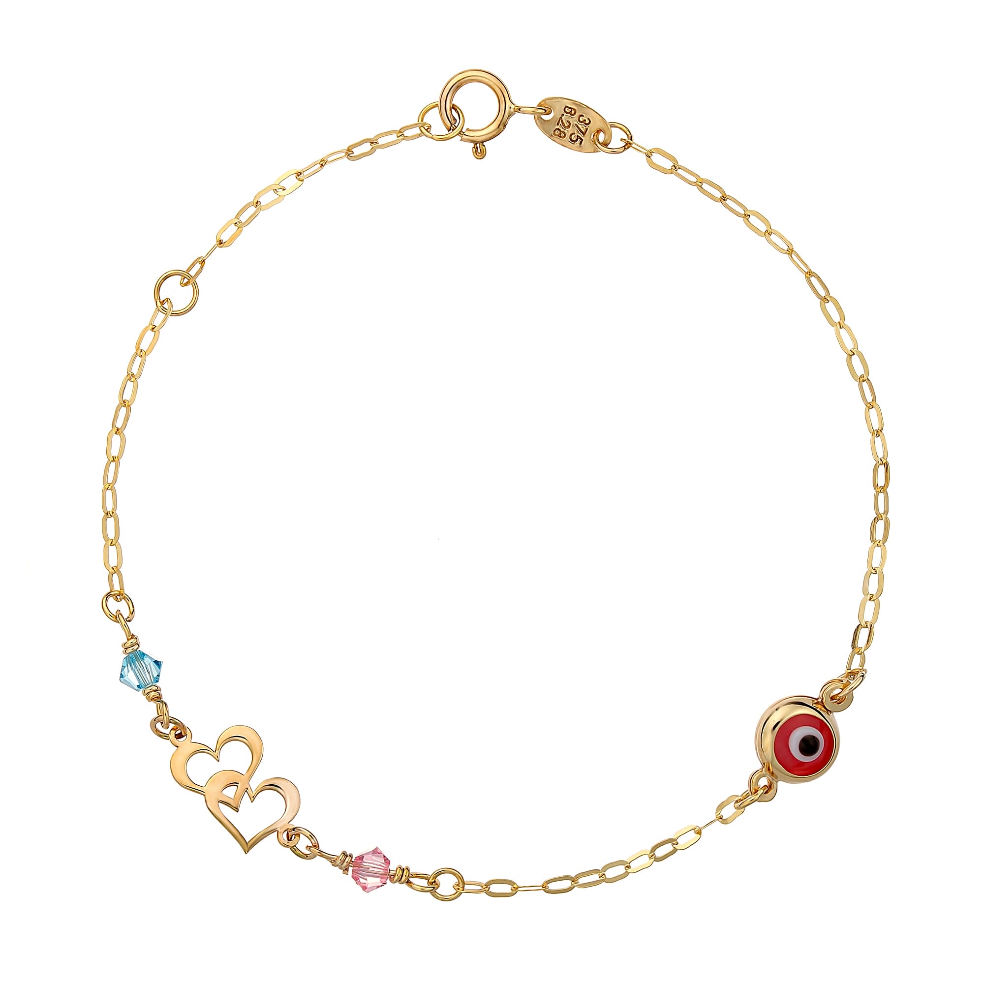 Βραχιόλι Ματάκι,Καρδιές, Χρυσό Για Γέννηση-Βάφτιση Με Ρόζ Σμάλτο 9Κ